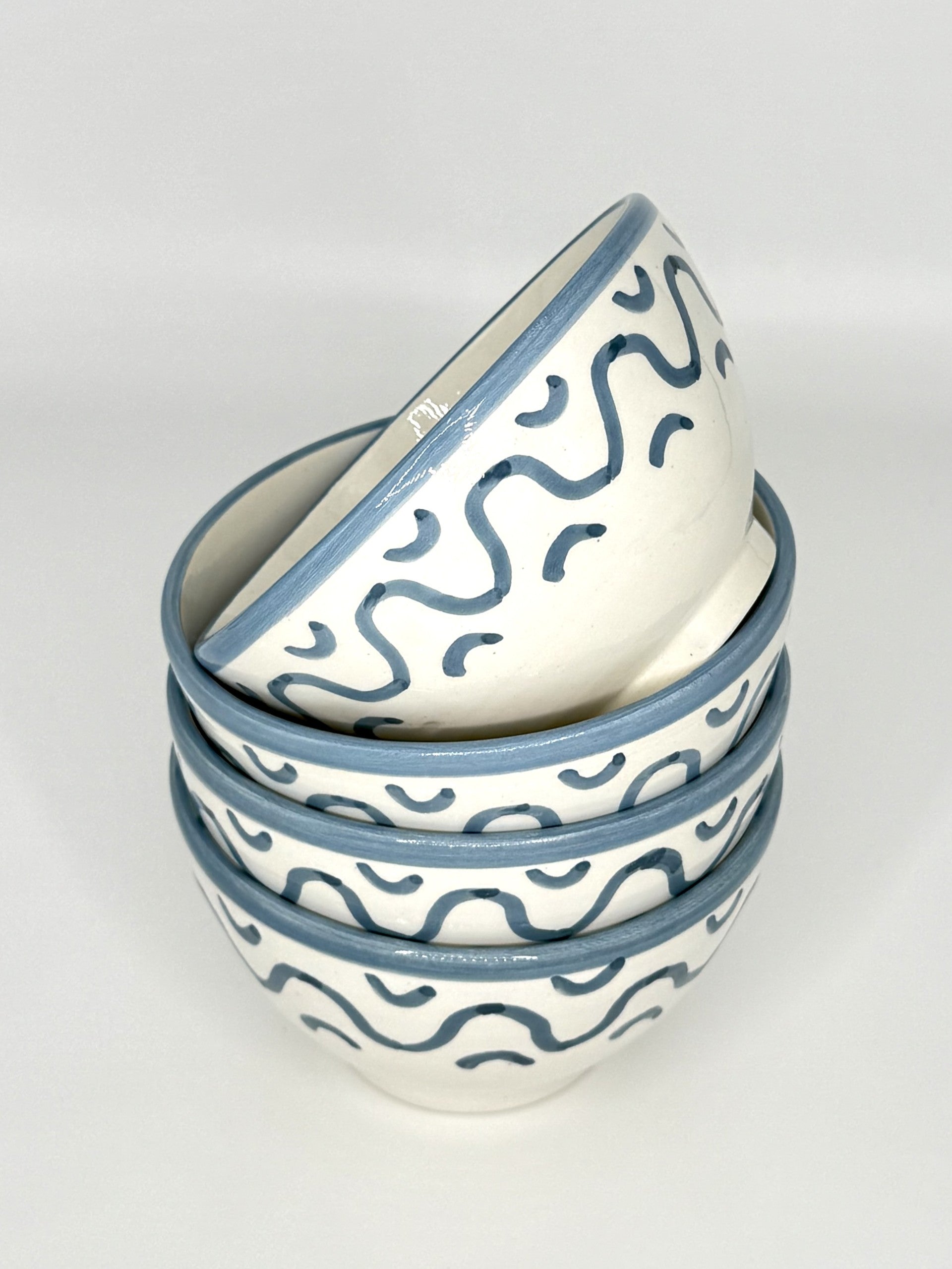 Individual bowl, handmade in Morocco from white clay, hand painted with a soft blue wave design that transports you to the seaside, glazed clear.