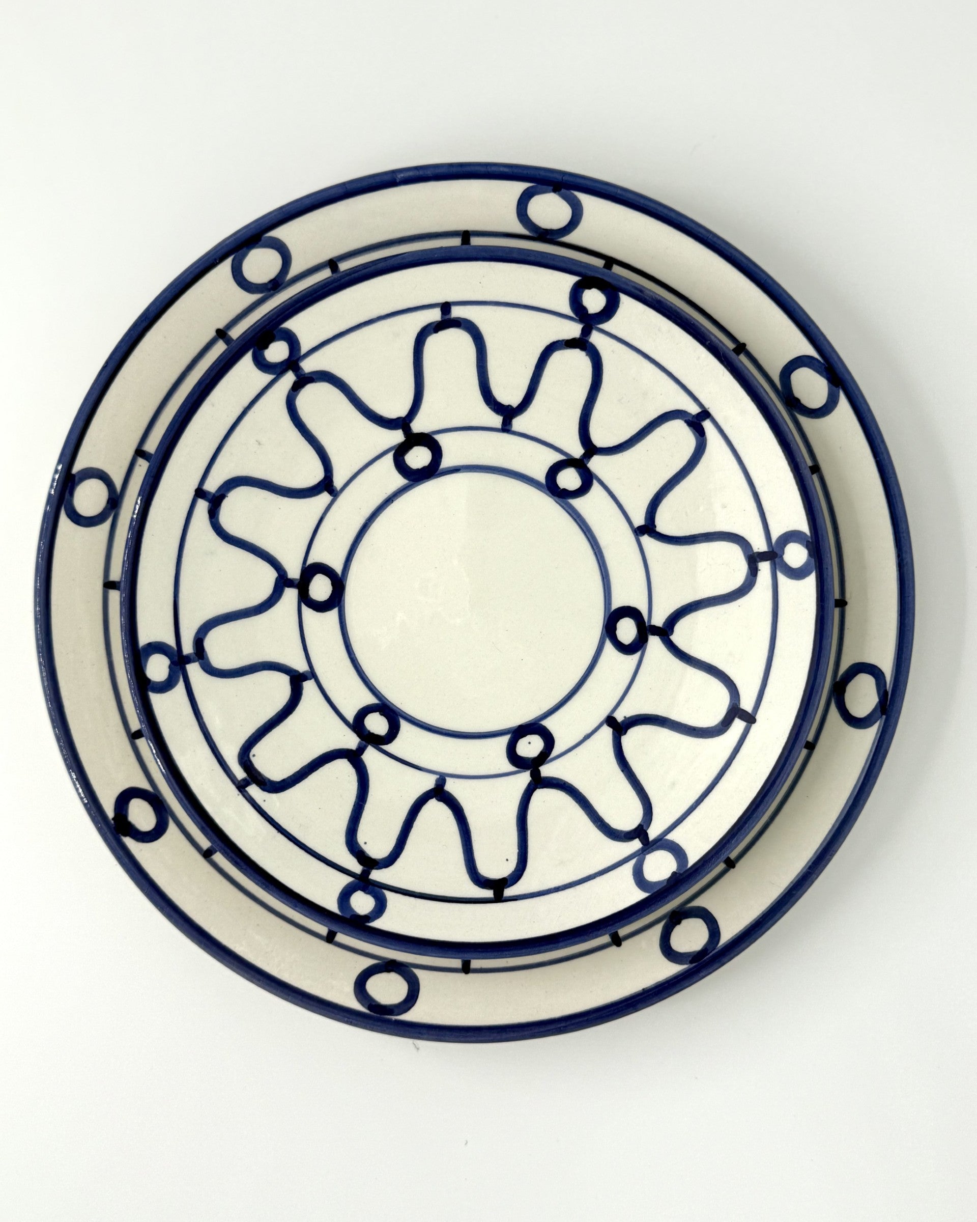 Dessert plate, handmade in Morocco from white clay, featuring a blue Med-inspired design and clear glaze.