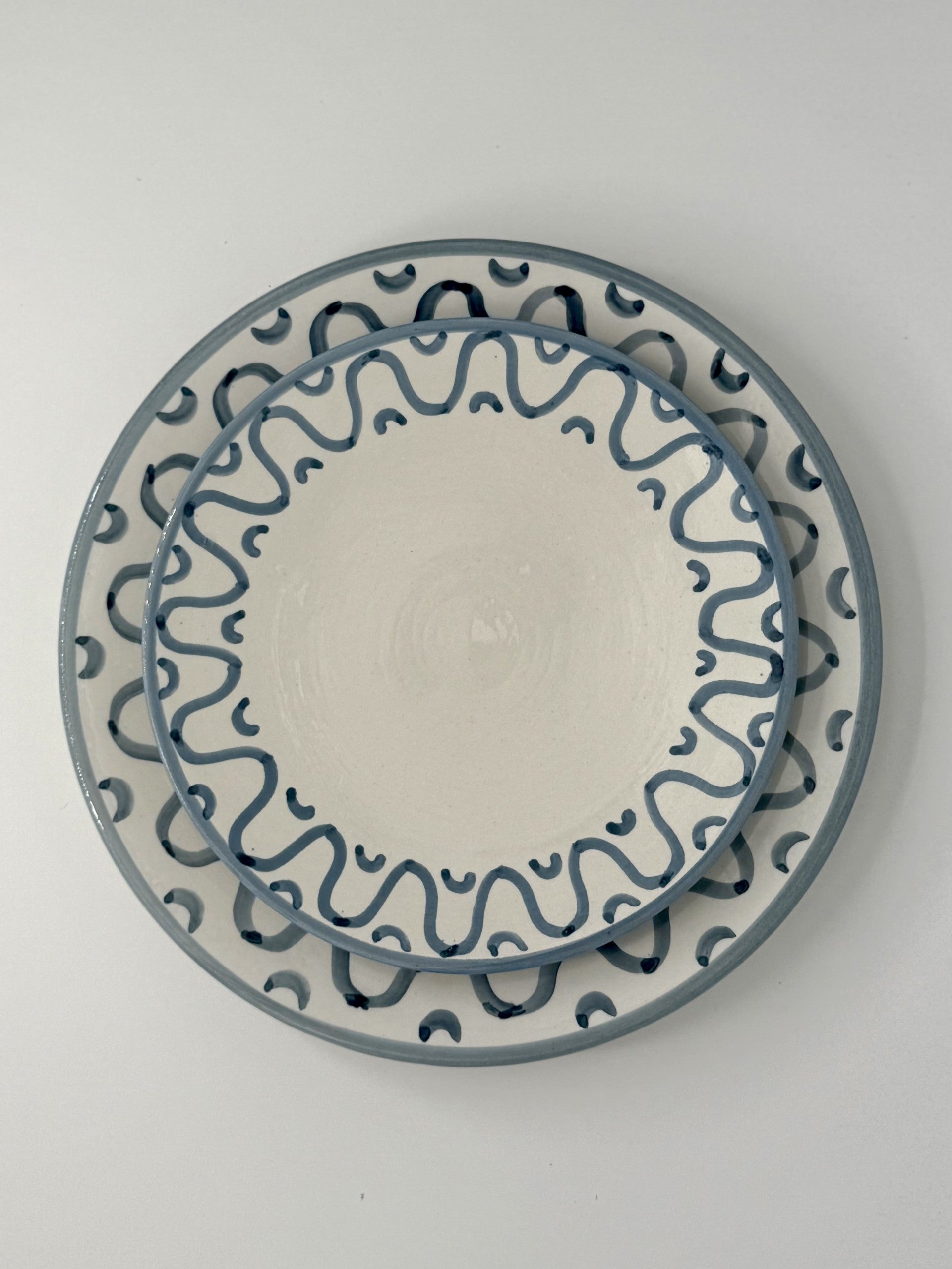 Dinner plate, handmade in Morocco from white clay, hand painted with a soft blue wave design that transports you to the seaside, glazed clear.