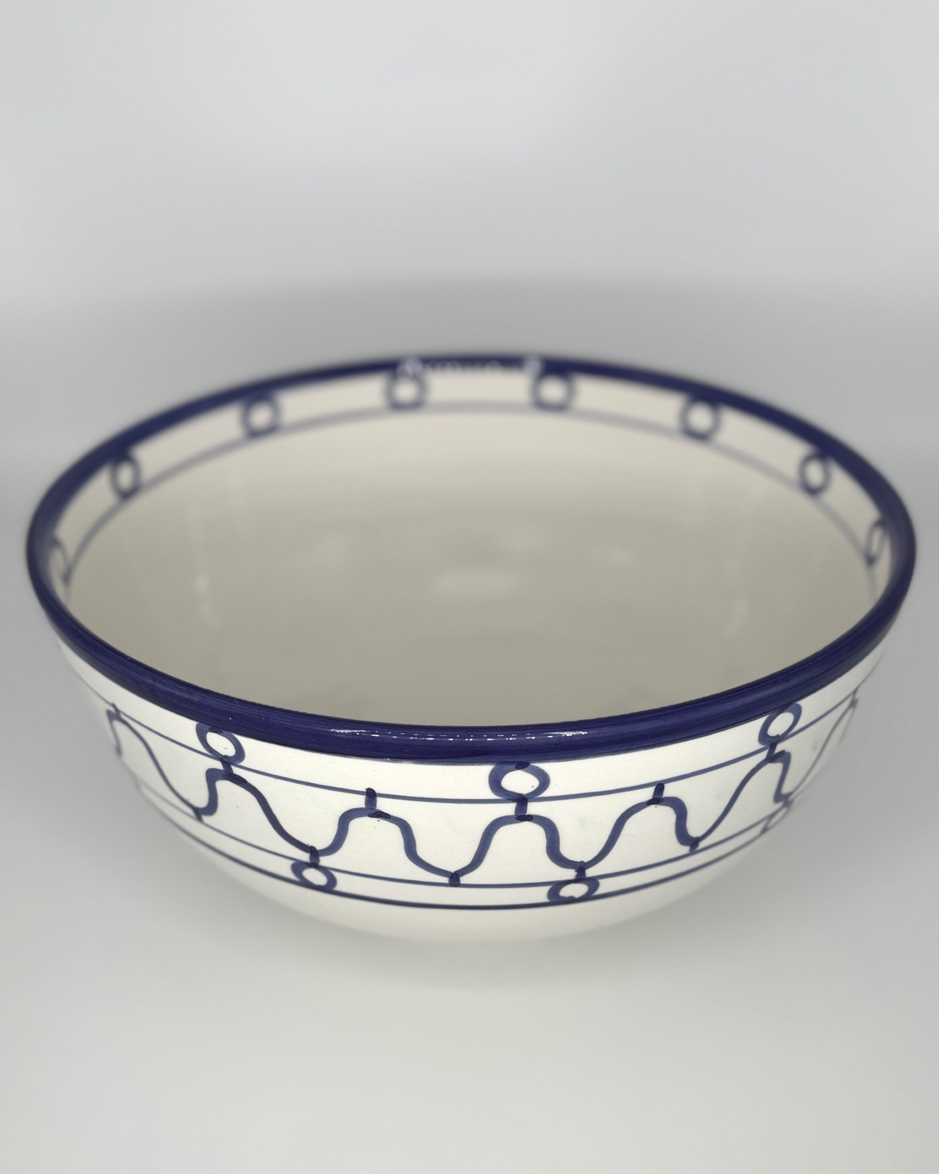 Small salad bowl, handmade in Morocco from white clay, featuring a blue Med-inspired design and clear glaze.