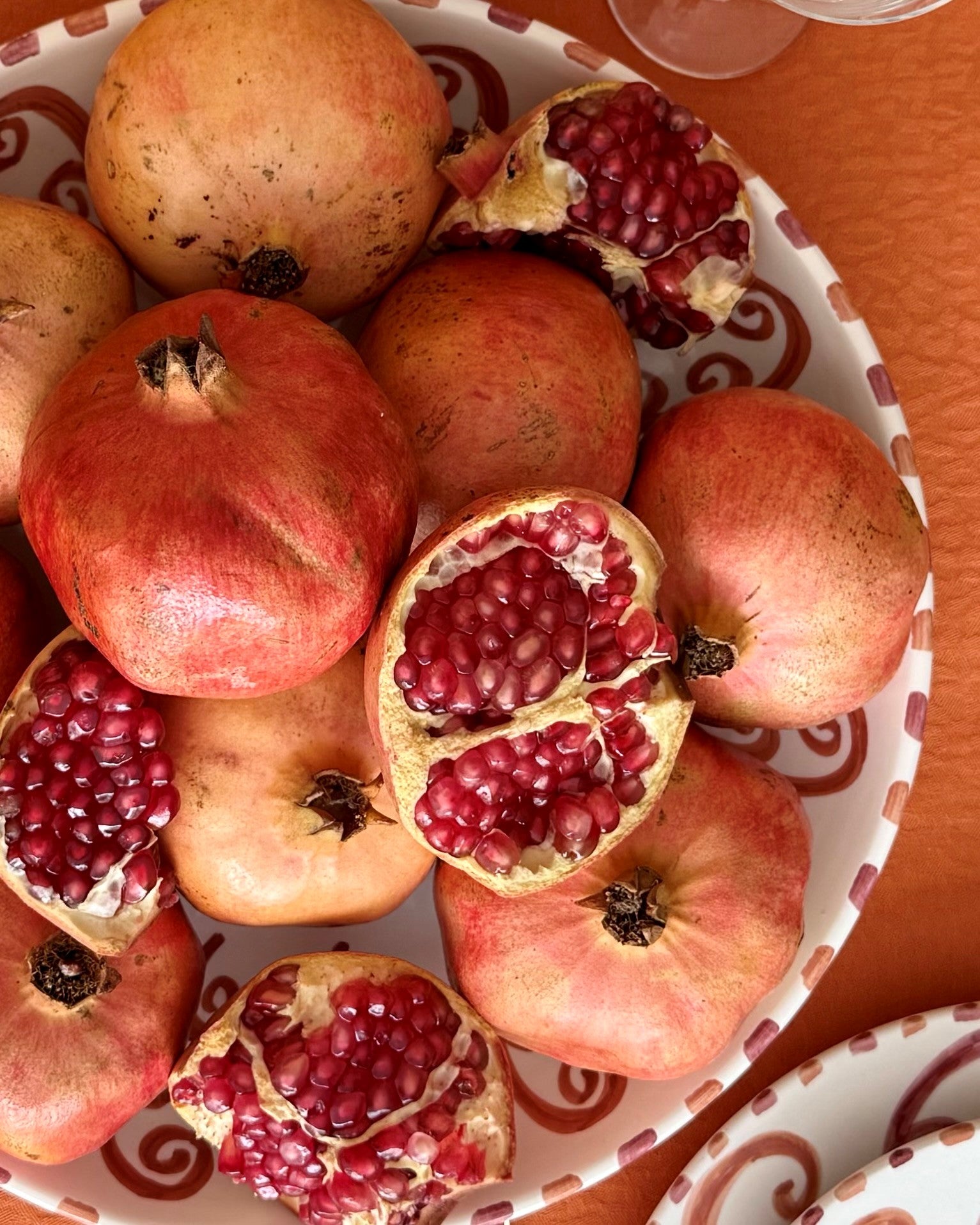 Serving platter, handmade in Morocco from white clay, featuring a design in sienna and ochre tones, glazed clear.